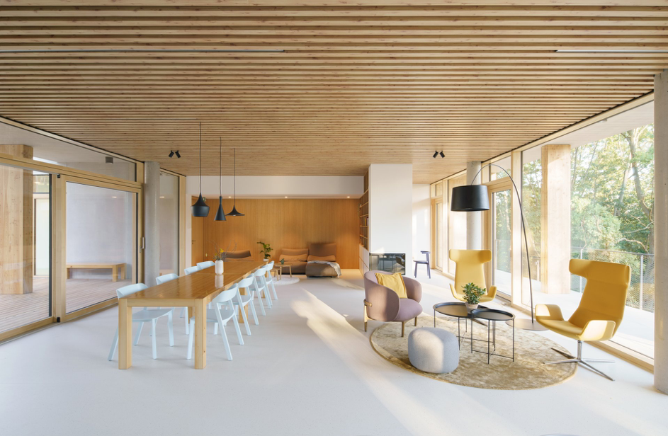 Objekt je koncipován do tří výškových úrovní: technické a provozní zázemí se nachází ve spodním podlaží, hlavní obytné patro uprostřed nabízí dětské pokoje, společné prostory a vstup na terasy. V nejvyšší úrovni je situováno ubytování rodičů a navazující střešní zahrady otevřené do krajiny. Kombinace přírodních materiálů, především dřeva, a pohledového betonu dodává domu hřejivost, stabilitu a důstojný charakter.