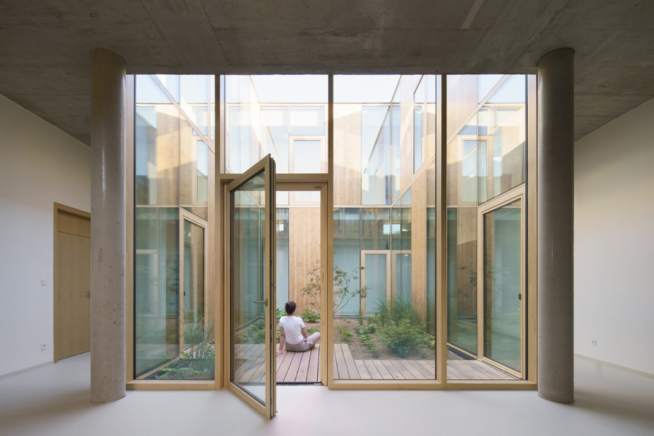 Architekti dokázali vytvořit prostředí, které spojuje praktické potřeby náročného provozu s hlubokým respektem k lidskému prožívání. Budova zasazená do svažitého terénu pracuje se světlem i krajinou tak, aby interiér přirozeně splýval s okolím. Srdcem domu je centrální atrium s jezírkem, vzrostlými stromy a květinovými výsadbami – místo, kde mohou pacienti i jejich blízcí najít klid, nadechnout se a být spolu.